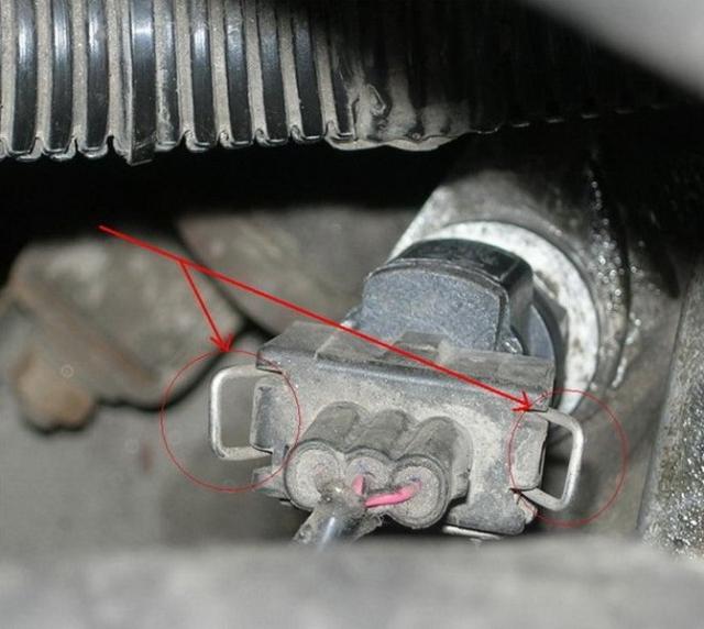 - Отсоединить электрический разъем, находящийся на самом датчике (нужно сжать металлические усики, затем снять фишку).