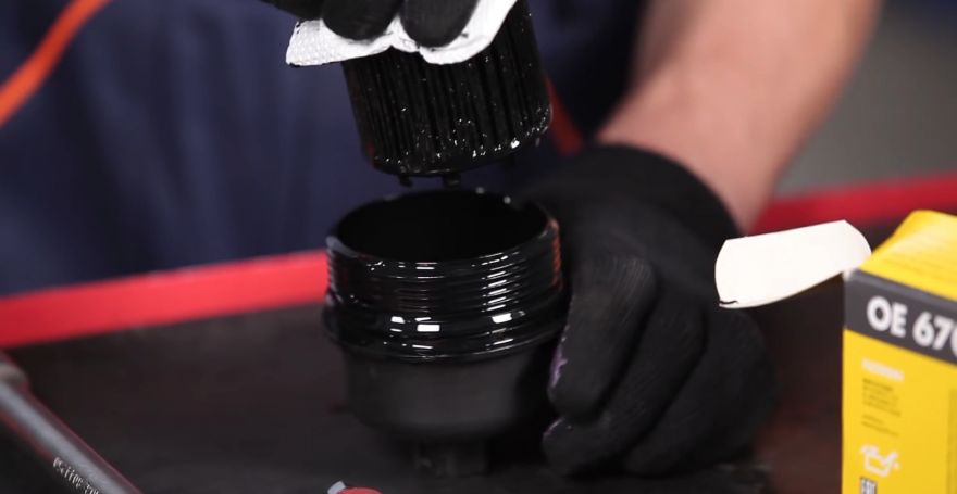 - С помощью головки под 24-м номером осторожно снимаем крышку масляного фильтра, а вместе с ним и уплотнительное кольцо. Оба элемента, скорее всего, нуждаются в замене, особенно при очень большом пробеге автомобиля. Посадочное место под фильтр надо прочистить, и затем поставить туда новые масляный фильтр и уплотнительную прокладку