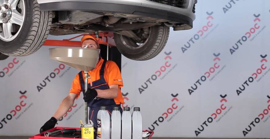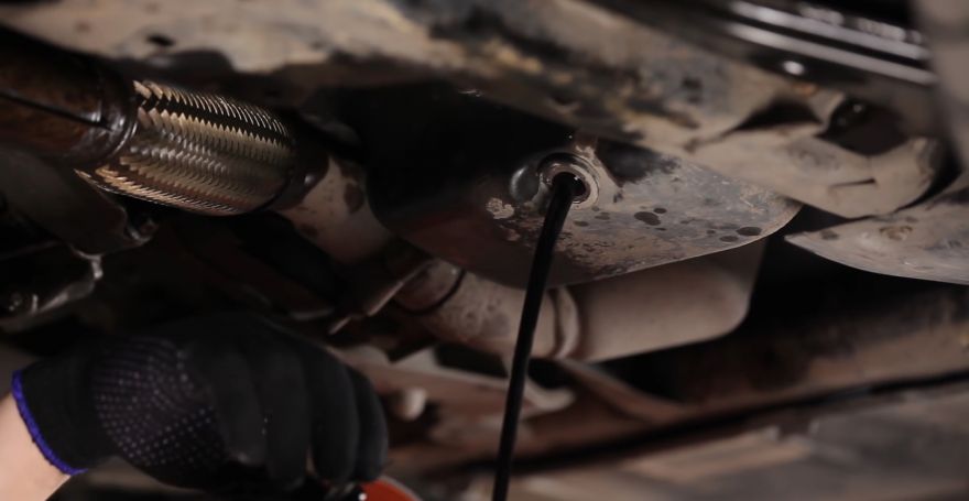 - Аккуратно выкручиваем пробку ключом «Торкс». После снятия пробке из отверстия начнет вытекать отработанное масло. Под него подставляем техническую емкость объемом 5-6 литров